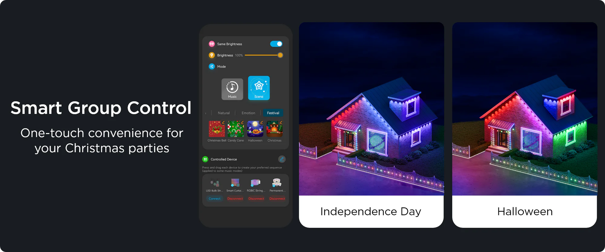 Have complete control at your fingertips with our intuitive smartphone app. Illuminate your home with a touch, switch between a spectrum of vibrant colors, and set timers to sync with the rhythm of day and night. Your holidays have never been brighter.